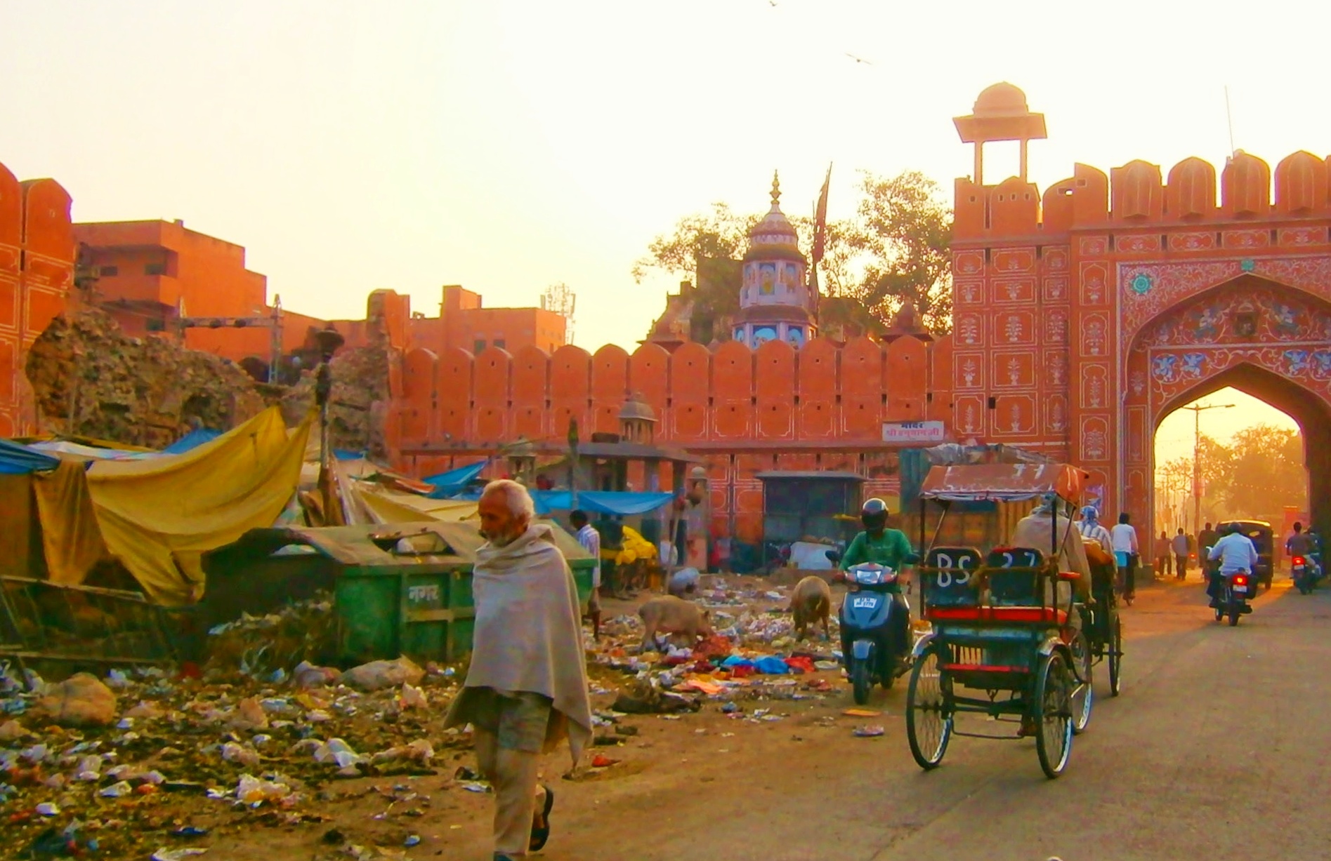 As with every other site in India you have the combination of the old, the new and the litter. Look closely at the image and you will see pigs moving through the rubbish. You have people living among it, litter pickers who need these piles of rubbish to work through. People come and go on various types of transport and it is a normal scene.